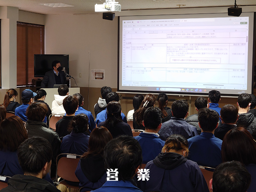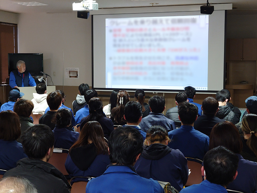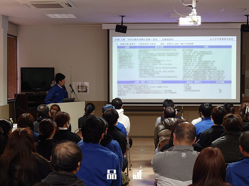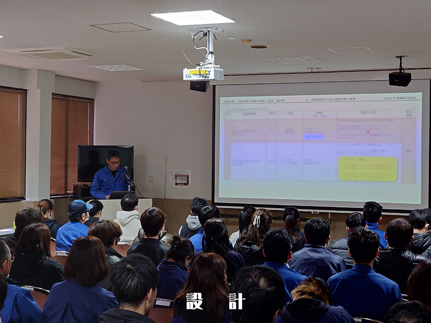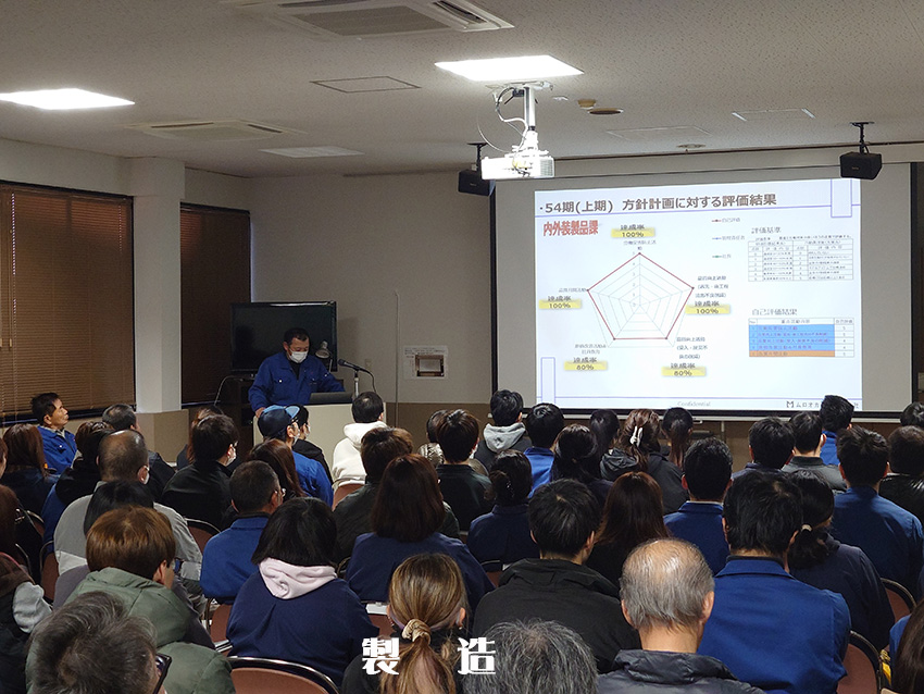 社長の年頭あいさつより始まり、各部門による部門方針の中間発表が行われ、本社工場 製造部より、大久保工場、品証部、設計部、営業部、理化学部、総務部と各部門の発表が行われ、最後に九州工場 工場長による講和が行われました。